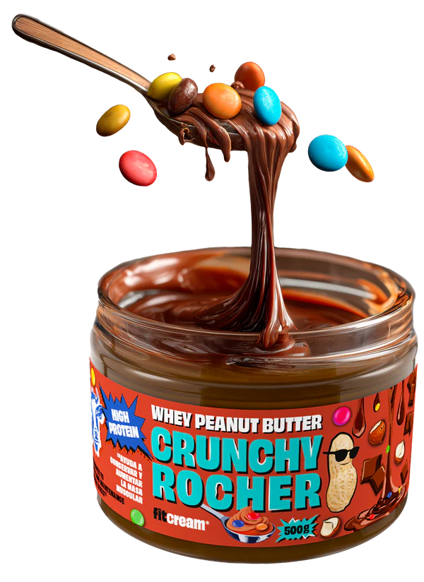 Crema proteica de cacahuete Fitcream con un 67 % de cacahuetes tostados, proteína de suero de leche y trozos crujientes tipo rocher. Aporta 30 g de proteína por cada 100 g, es baja en azúcares gracias a los edulcorantes naturales y está enriquecida con aceite MCT de coco. Su textura crujiente y sabor intenso hacen de Fitcream la opción perfecta para quienes buscan una crema de cacahuete proteica deliciosa y saludable.